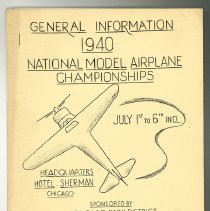 Booklet, cover reads: "GENERAL INFORMATION 1940 NATIONAL MODEL AIRPLANE CHAMPIONSHIPS, JULY 1st TO 6th INCL., HEADQUARTERS HOTEL SHERMAN CHICAGO, SPONSORED BY CHICAGO PARK DISTRICT AND CHICAGO DAILY TIMES, OUTDOOR EVENTS PARKSITE 33 79TH & KELLER AV, INDOOR EVENTS INTERNATIONAL AMPHITHEATRE 42ND & HALSTED STREETS" The 1940 Nats was held July 1 to 6 in Chicago, Illinois. (Registration on July 1.) Although some original material from the 1940...