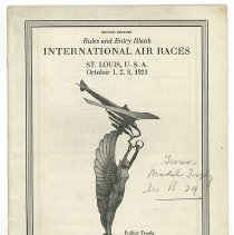 Booklet, on cover: "SECOND EDITION, Rules and Entry Blank, INTERNATIONAL AIR RACES, ST. LOUIS, U.S.A., October 1, 2, 3, 1923, Pulitzer Trophy, St. Louis Aeronautic Corporation and Flying Club of St. Louis, Inc." [Mulvihill event listed] Per the commemorative program book from the 50th Nats (1976), celebrating the 50th anniversary of the Nats, Edward J. Lange won first place in Event Number 6 at the 1923 air races (considered the first Nats), w...