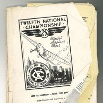 Booklet, on cover, "Twelfth National Championship, NAA, Model Airplane Meet, Detroit, July 5-9, MEET HEADQUARTERS - HOTEL FORT SHELBY, Under Direction and Supervision of The Detroit Metropolitan Council of Exchange Clubs, Approved by the National Exchange Club, Sanctioned by the National Aeronautic Association, Indoor Events GROSSE ILE HANGAR, Outdoor Events WAYNE COUNTY AIRPORT", 1939. [Note: Two loose entry blanks were found tucked inside c...