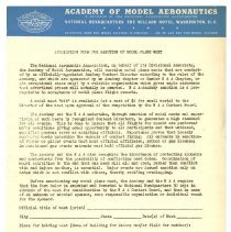 Application for model airplane meet sanction, letterhead printing at top: "ACADEMY OF MODEL AERONAUTICS, A DIVISION OF THE NATIONAL AERONAUTIC ASSOCIATION, NATIONAL HEADQUARTERS: THE WILLARD HOTEL, WASHINGTON, D.C...." . Printed title below: "APPLICATION FORM FOR SANCTION OF MODEL PLANE MEET", circa 1941. Information requested on form: Official title of meet, city, state, meet date, building/field name, sponsor name, sponsor's guarantor, even...