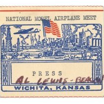 Badge, paper press badge, printed on front side: "NATIONAL MODEL AIRPLANE MEET, PRESS, WICHITA, KANSAS", handwritten on front side: "AL LEWIS - BEACON", handwritten on back side: "Frontier Rm - [Lassern?]". The 1946 Nats was held Thursday, August 29 to Monday, September 2 in Wichita, Kansas. (Registration and meetings on August 29.) Per the official 1946 Nats program, Nats HQ and Indoor Free Flight was at the Wichita Forum, Rise off Water w...